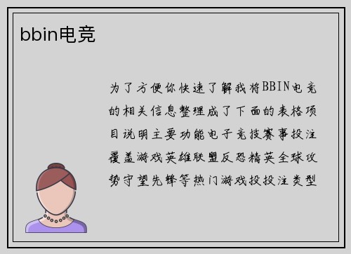 为了方便你快速了解,我将BBIN电竞的相关信息整理成了下面的表格: | 项目 | 说明 | | :-- | :-- | | 主要功能 | 电子竞技赛事投注 | | 覆盖游戏 | 《英雄联盟》、《反恐精...