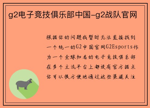 根据你的问题,我暂时无法直接找到一个统一的“G2中国官网”。G2 Esports作为一个全球知名的电子竞技俱乐部,在多个主流平台上都设有官方据点,你可以很方便地通过这些渠道关注他们。 下面这个表格整理...